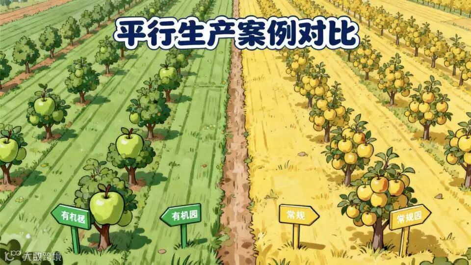 构成平行生产的情况:老王在相邻的两块地(同一生产单元)都种了外观相同的苹果,一块按有机标准种植,另一块按常规方法种植。这就构成了典型的平行生产。 -