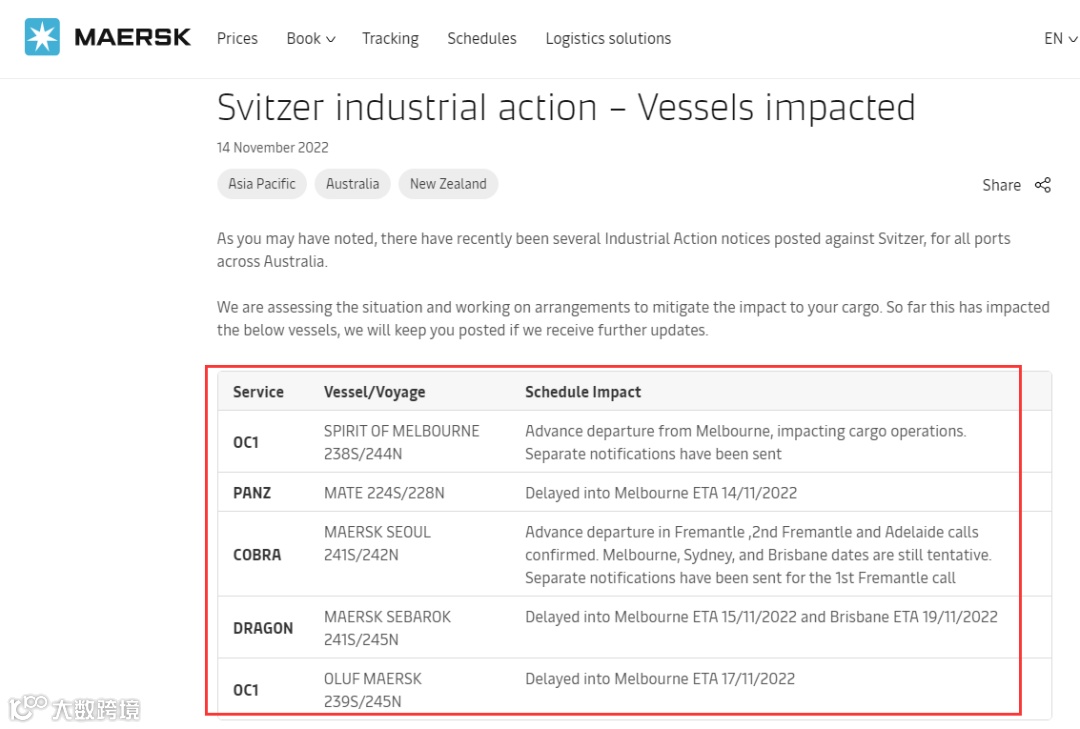 马士基官网发布了相关预警,到目前为止,这已经影响了以下船只。
