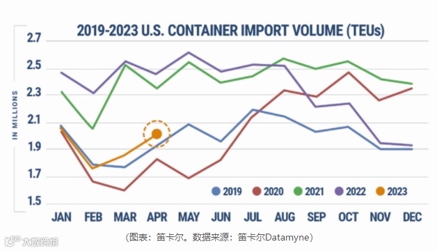 笛卡尔周一表示,美国港口在4月份进口量为202万teu,比3月份上涨了9%,比去年下降了18%。