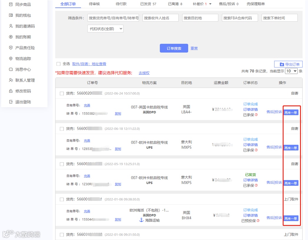 针对部分货兜客户提出的,想重复下单固定渠道,每次都需要重新填写下单信息的繁琐流程,货兜迅速上线了“再来一单”的功能。
