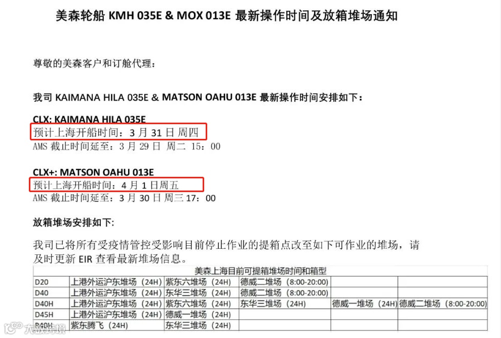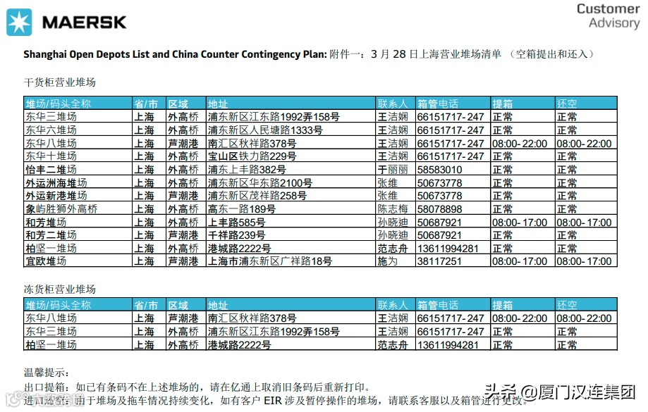 进提空箱和还箱:上海部分仓库自3月28日起关闭,直至另行通知。