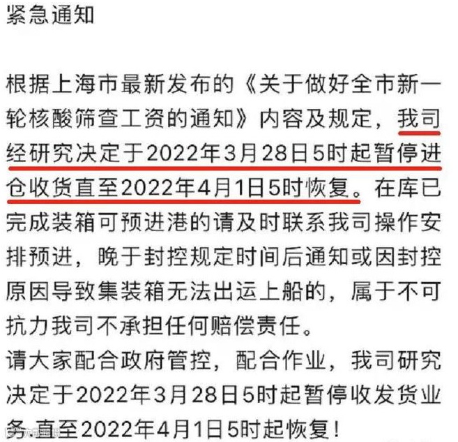 3月28日~4月1日,首批封控区域内的物流企业已发布通知暂停进仓收货、发货业务,直至2022年4月1日5时恢复。