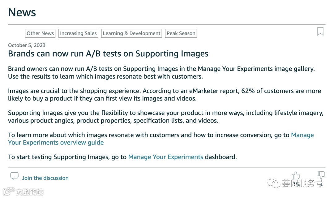 上周,亚马逊通过卖家中心新闻,建议每个卖家都要尽量通过:品牌 - 管理实验中的A/B测试判断文案的优质水平,相信在此之后,也是建议每个卖家需要尽快在节日季生成AI文案。而老荟员都应该知道,一个Listing的A/B测试等于多文案发布,其曝光量也会比现有文案更高。