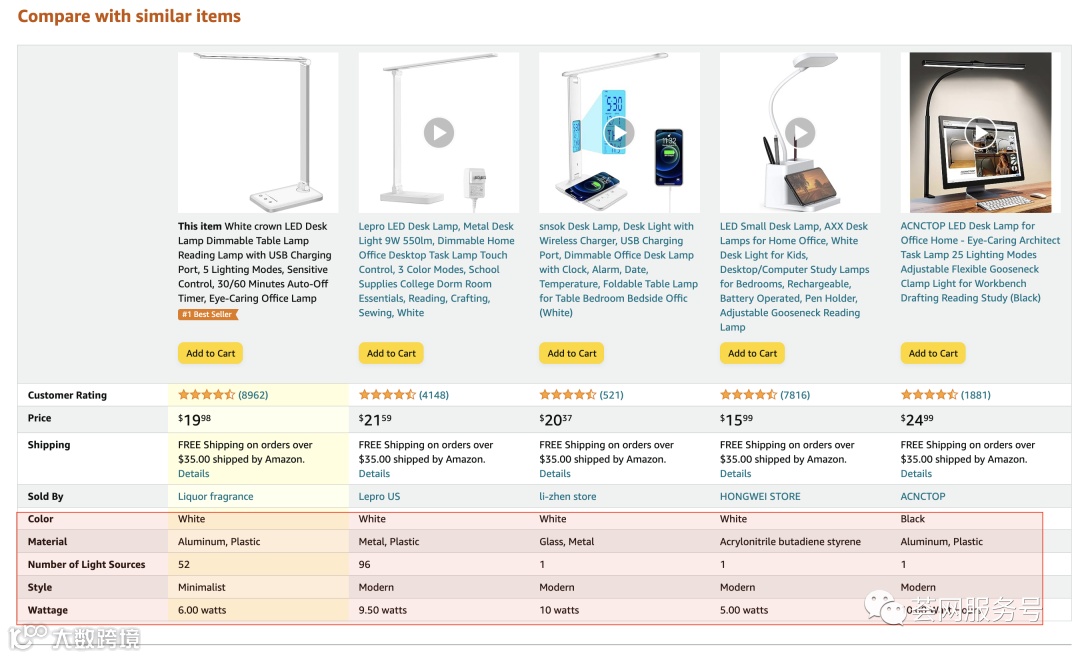 之后,在商品详情页下方的推荐产品对比表中,用以上同样方法查看属性值,并填入自己的Listing信息中