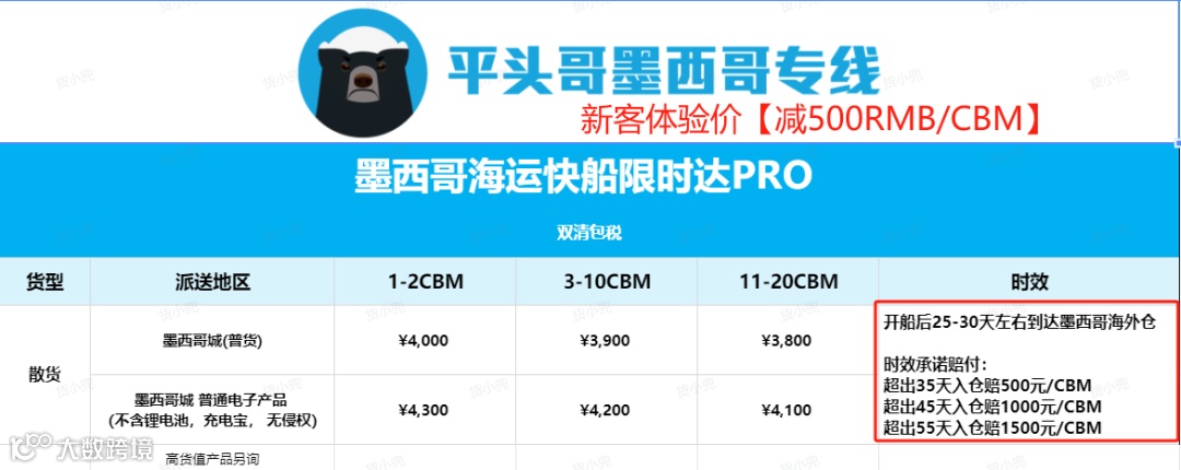 针对到墨西哥城电商平台仓库的货物,我们推出海运快船限时达PRO,新客首次体验可【减500元/CBM】!
