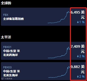 根据波罗的海航运交易所发布的FBX指数显示,截止上周五,FBX集装箱海运价格平均为6495美元/FEU,较去年9月份的历史高点已重挫了逾41%。