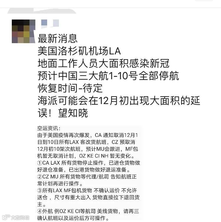 11月28日,洛杉矶拆板人员大面积感染新冠疫情,让原本就寸步难行的美线物流“濒临停摆”,中国国际航空公司通知取消12月1日到10日所有LAX客改货航班。