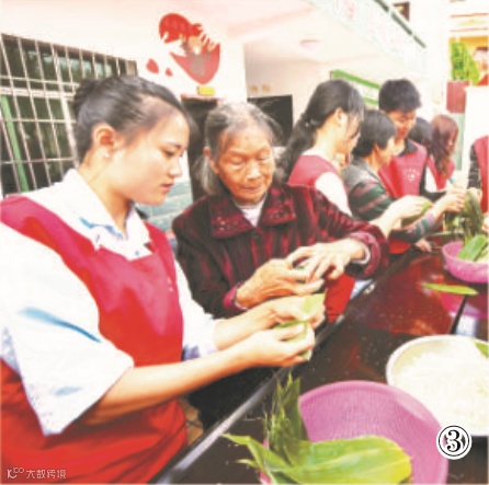 ▲新余市分宜县上松村颐养之家老人与志愿者一起包粽子。胡谷城摄