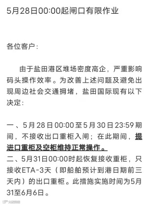 盐田港口只接收ETA-3天的出口重柜,将加剧集装箱短缺。