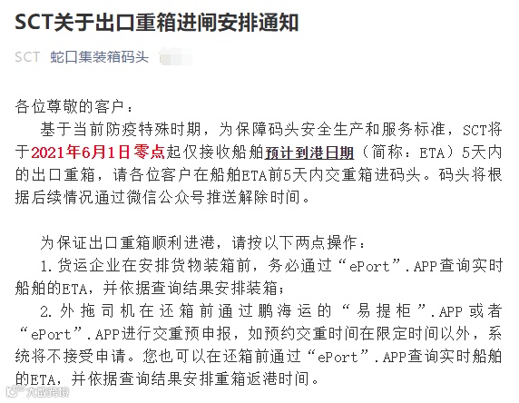 6月1日起,深圳蛇口/赤湾码头仅接收船舶预计到港日期5天内的出口重箱。