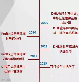 21世纪初期,经过将近20年时间的沉淀发展,四大快递在占据中国国际快递市场的基础上开始以寻求国内公司合作的方式占据国内业务市场。通过这样的方式,四大快递能迅速利用不同快递企业现有网络,迅速进行网络扩张,并逐步涉足中国业务市场。其中以TNT收购天地华宇、联邦快递收购大田联邦快递有限公司中的50%股权、DHL收购三家国内快递公司为主要标志。
