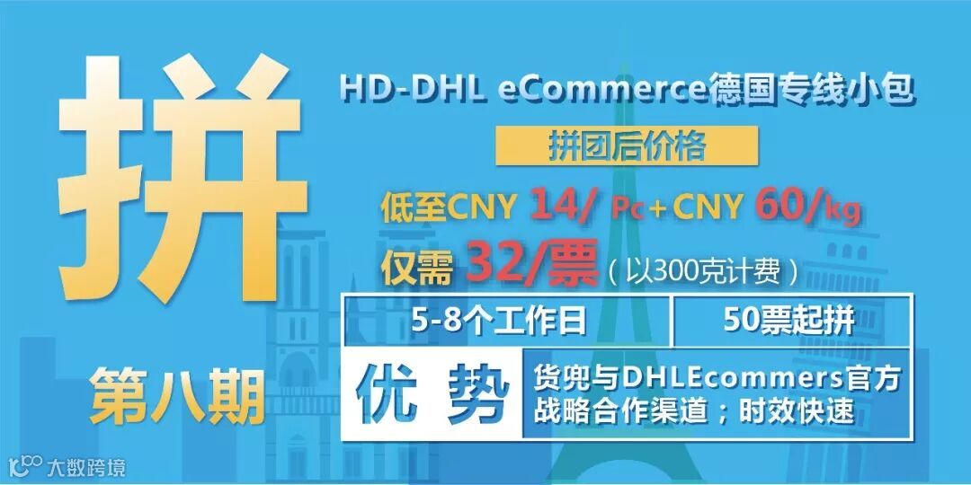 【拼兜兜】HD-DHL eCommerce德国专线小包,拼团后低至CNY 32/ Pc