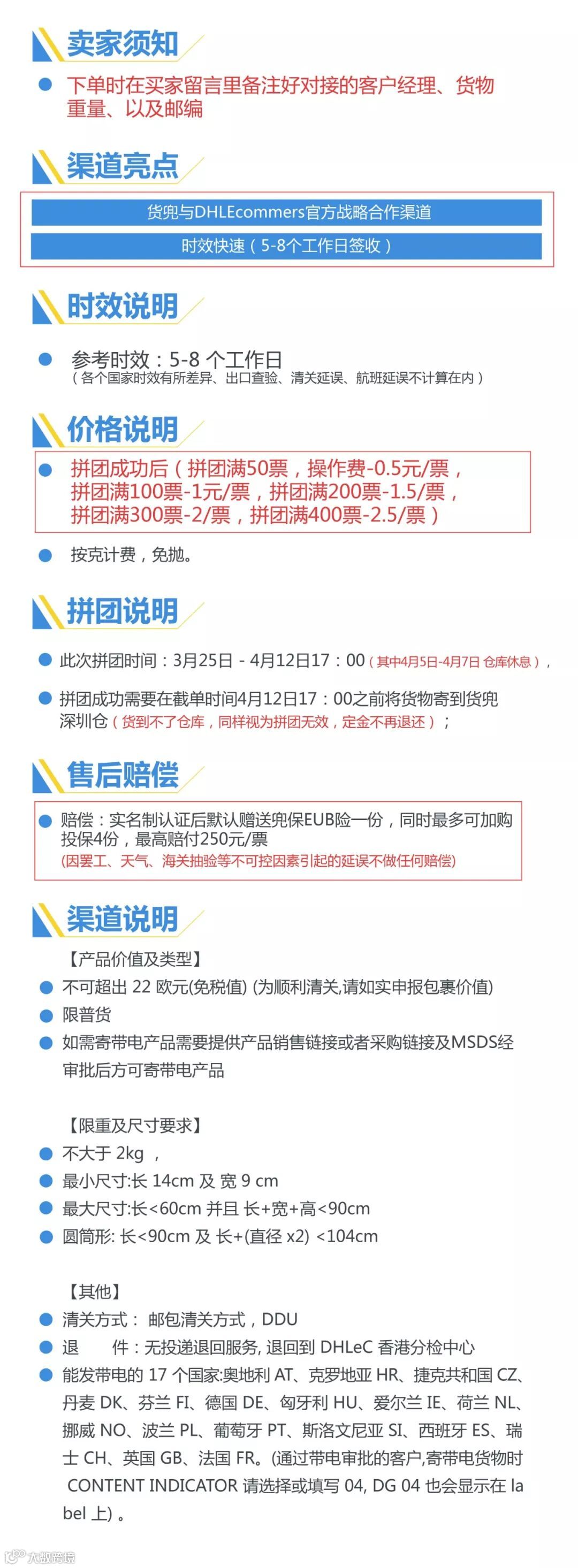 导读:HD-DHL eCommerce德国专线小包,拼团后低至CNY 32/ Pc!不限人数,拼足票数即可享受相对应折扣!