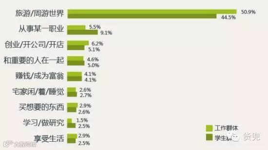 90后最渴望的事情是旅行,其中旅行愿望最为迫切的是工作中的90后,达50.9%,学生群体外出旅行的愿望为44.5%。