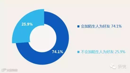 74.1%的90后会在即时通讯软件中,加陌生人为好友,25.9%不会加入陌生人。