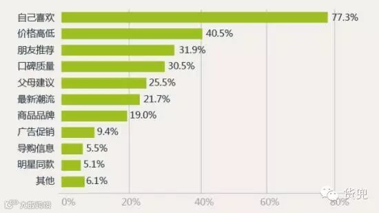 在日常购物时,77.3%的90后会注重自己是否喜欢,40.5%会关注价格高低,31.9%会受到朋友推荐的影响。
