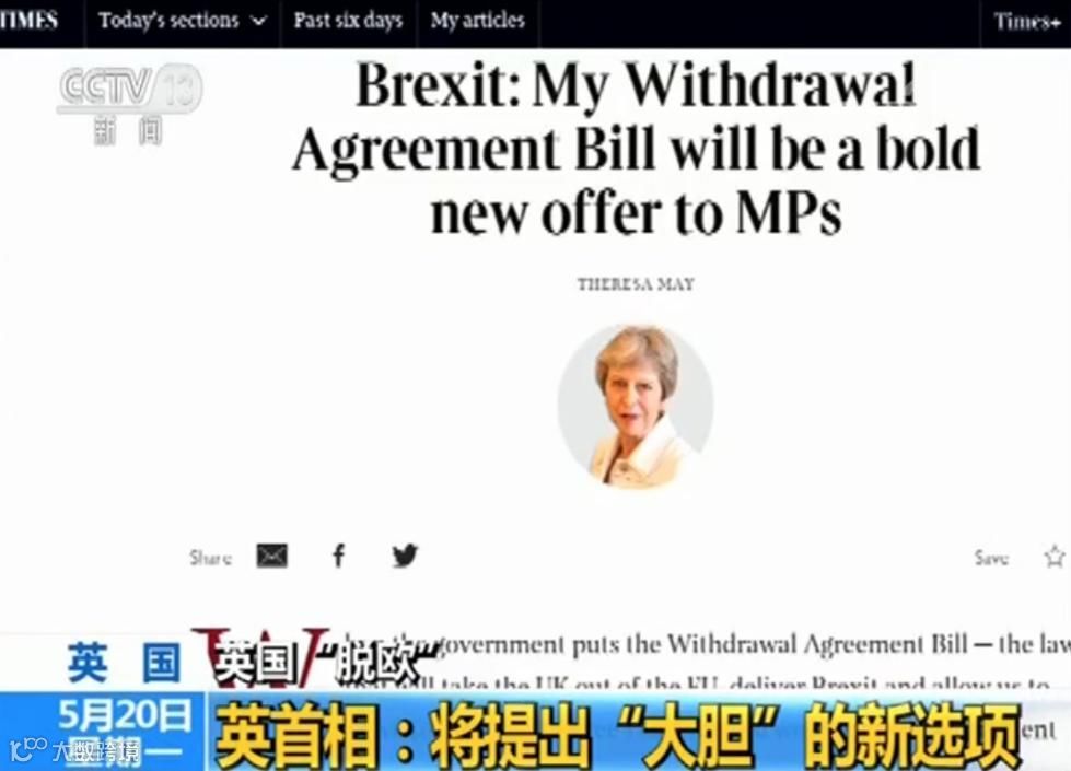 由于“脱欧”协议连续遭到议会下院否决,英国“脱欧”进程陷入停滞。目前,英国“脱欧”的期限已延长至今年10月31日。而按照计划,英国议会下院将于下个月初,就首相特雷莎⋅梅提出的“脱欧”协议进行新一轮投票——特雷莎⋅梅5月19日表示,她将提出一个“全新的”、“大胆的”选项。