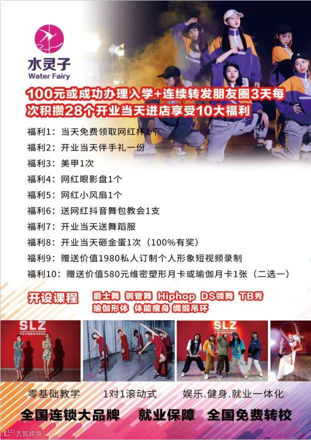 水灵子舞蹈是一家主营现代流行舞的全国连锁机构。中华总部于2011年6月18日在广州市新塘镇解放北路成立。分校遍布全国1300+连锁!学校专业培训课程:钢管舞、爵士舞、酒吧领舞、TB秀、模特形体,吊环舞,绸缎舞。开设课程有:入门兴趣班、健身娱乐班、专业减肥班、全能教练班,店长培训班。并与国内多家舞蹈协会合作,与各大电视台及演艺公司长期合作。11年多累计培训学员多达二十余万人,培训毕业到全国各地任教的专业教练30000余人。