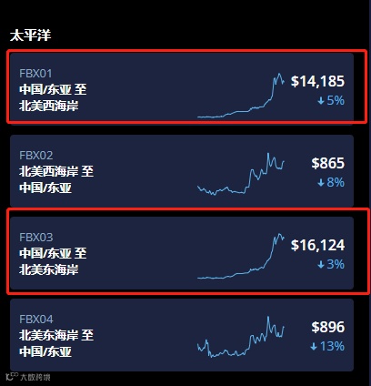 根据波罗的海运价指数(FBX),截止11月21日,中国出口美国海运费用整体下跌。