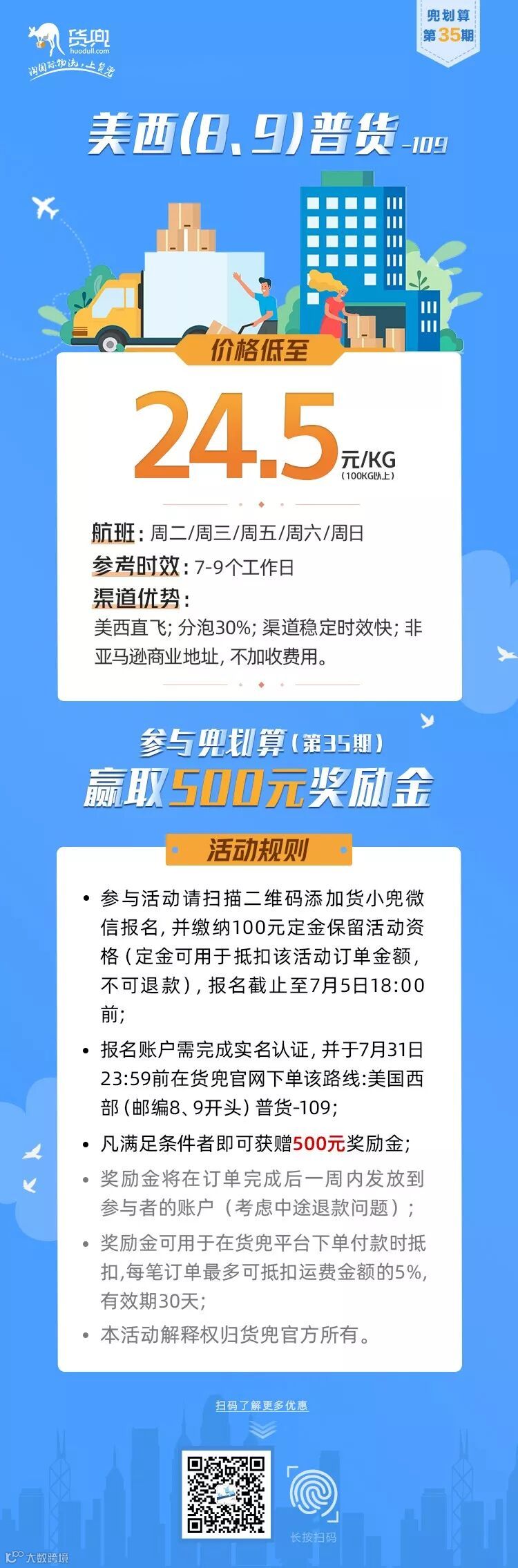 报名账户需完成实名认证,并于7月31日23:59前在货兜官网下单该路线:美国西部(8、9)普货-109;