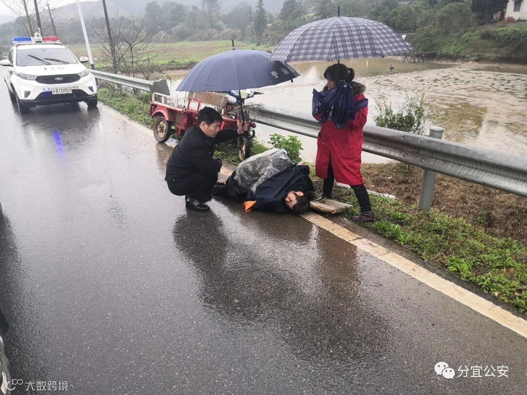 当天中午13时许,分宜县公安局洋江派出所民警与村义务巡逻队在辖区巡防时,发现一名老人独自躺在路边,意识不清醒,身旁还侧翻了一辆电动三轮车。民警担心老人安危,立即拨打120急救电话。在雨中,民警与巡逻人员为老人撑起雨伞,并一直在呼唤着老人让其保持清醒,随后救护车赶到现场,及时将老人送往医院治疗。