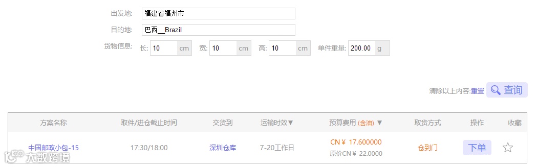方案一:中国邮政小包-15 7-20工作日 17.6元(含油)