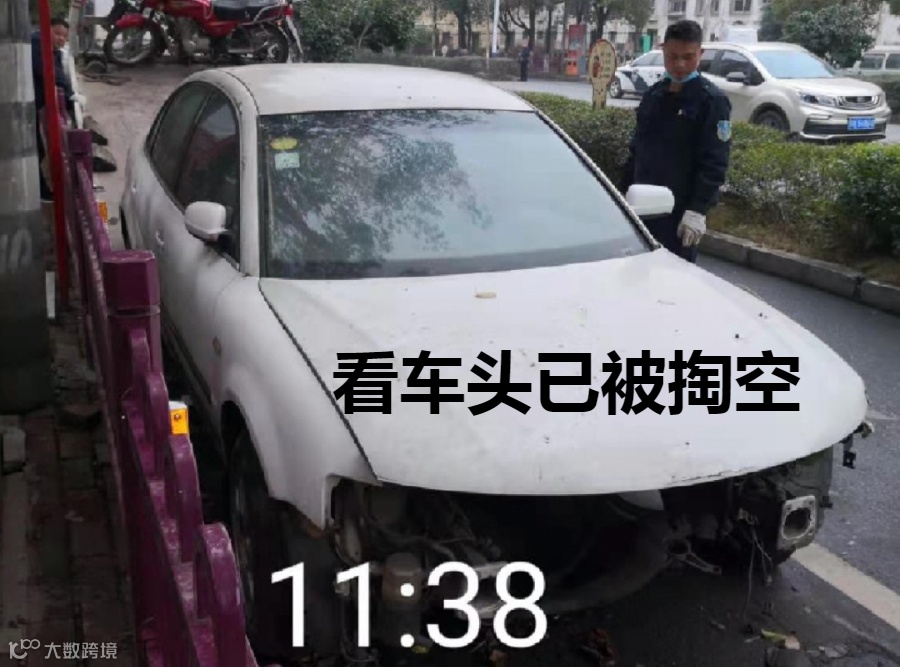 ◎查获经过:大队民警在巡逻中发现北湖西路公共车位内有一辆僵尸车停放,小车车头已被掏空、前后车牌丢失。