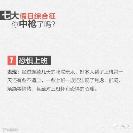 导读:假期综合症看这里今天是小长假还剩最后一天了,你是否做什么事都提不起精神?你是否对上班产生厌恶或恐惧?你是否失
