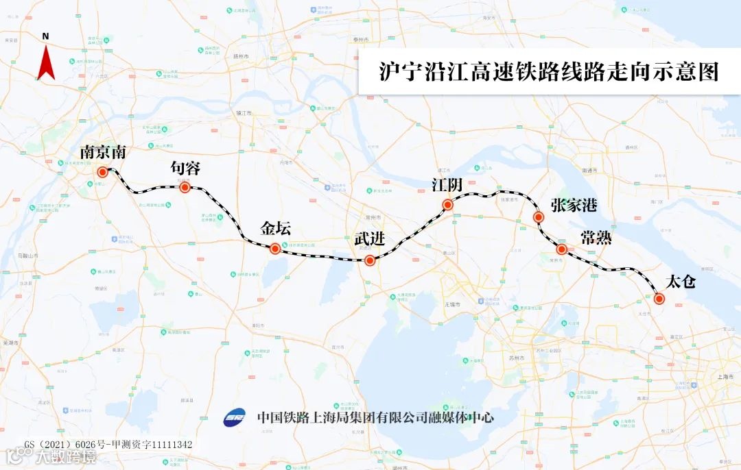 据了解,沪宁沿江高速铁路起于南京南站,止于太仓站,途经南京市、句容市、常州市、江阴市、张家港市、常熟市、太仓市,正线全长278.53千米,共设8座车站,最高设计速度350千米/小时。