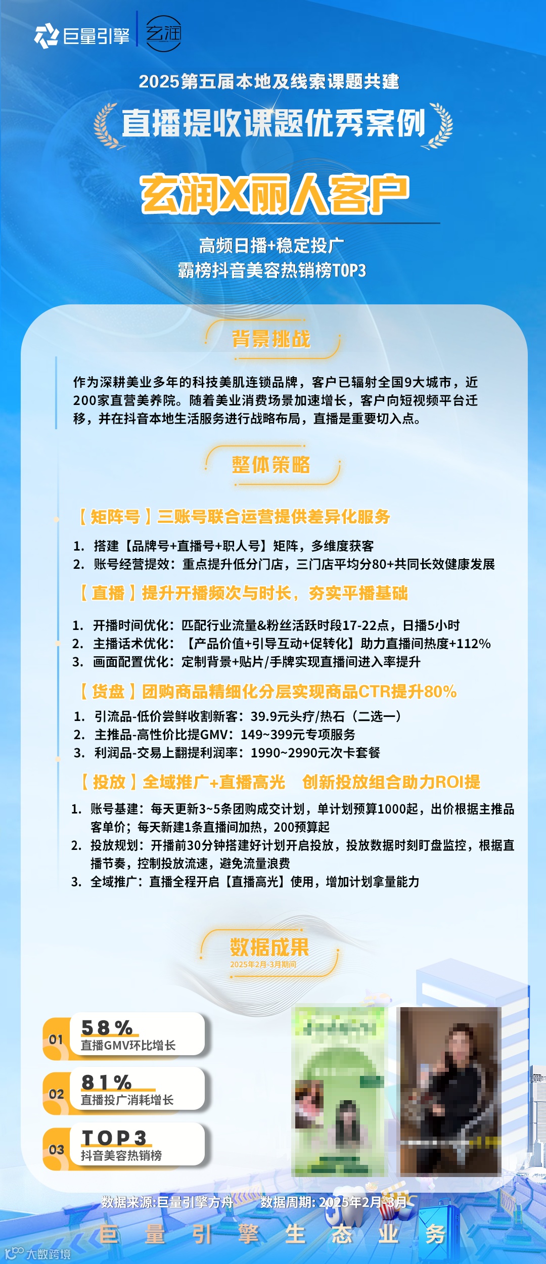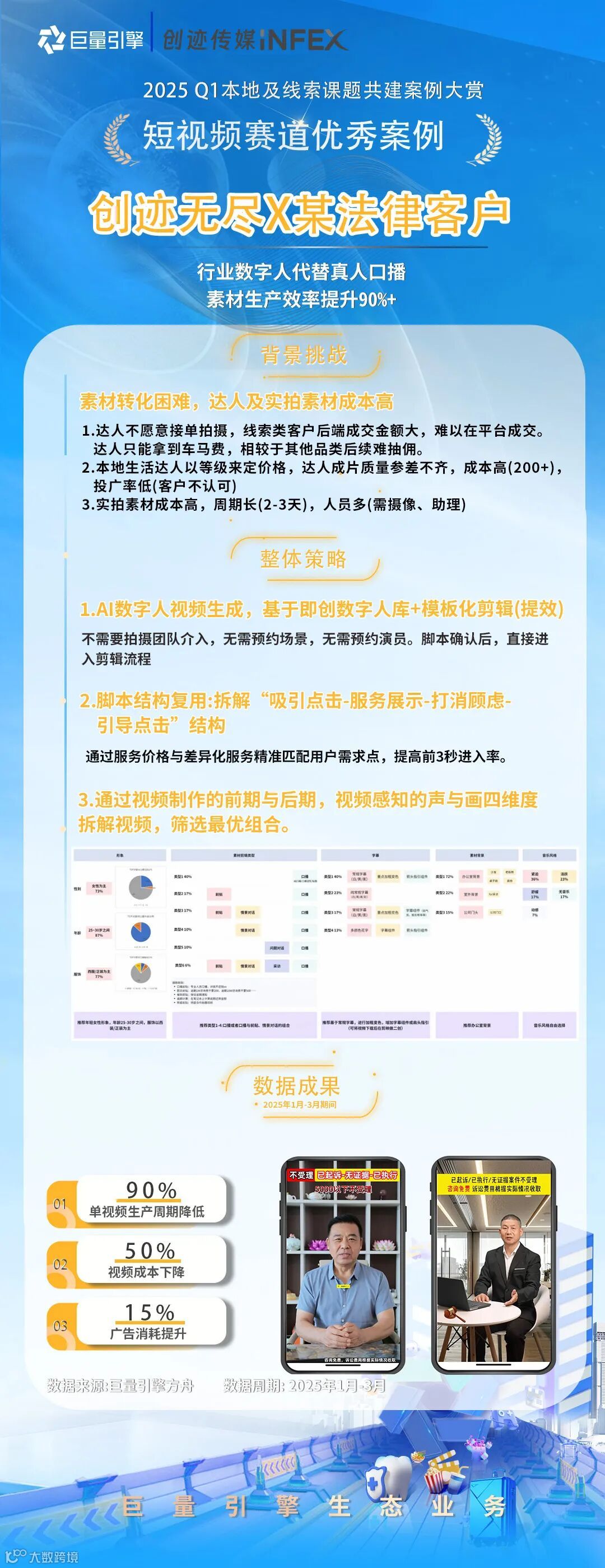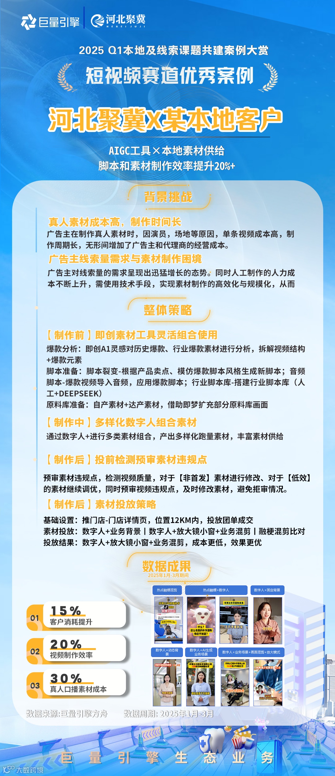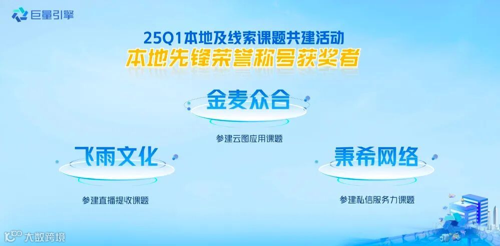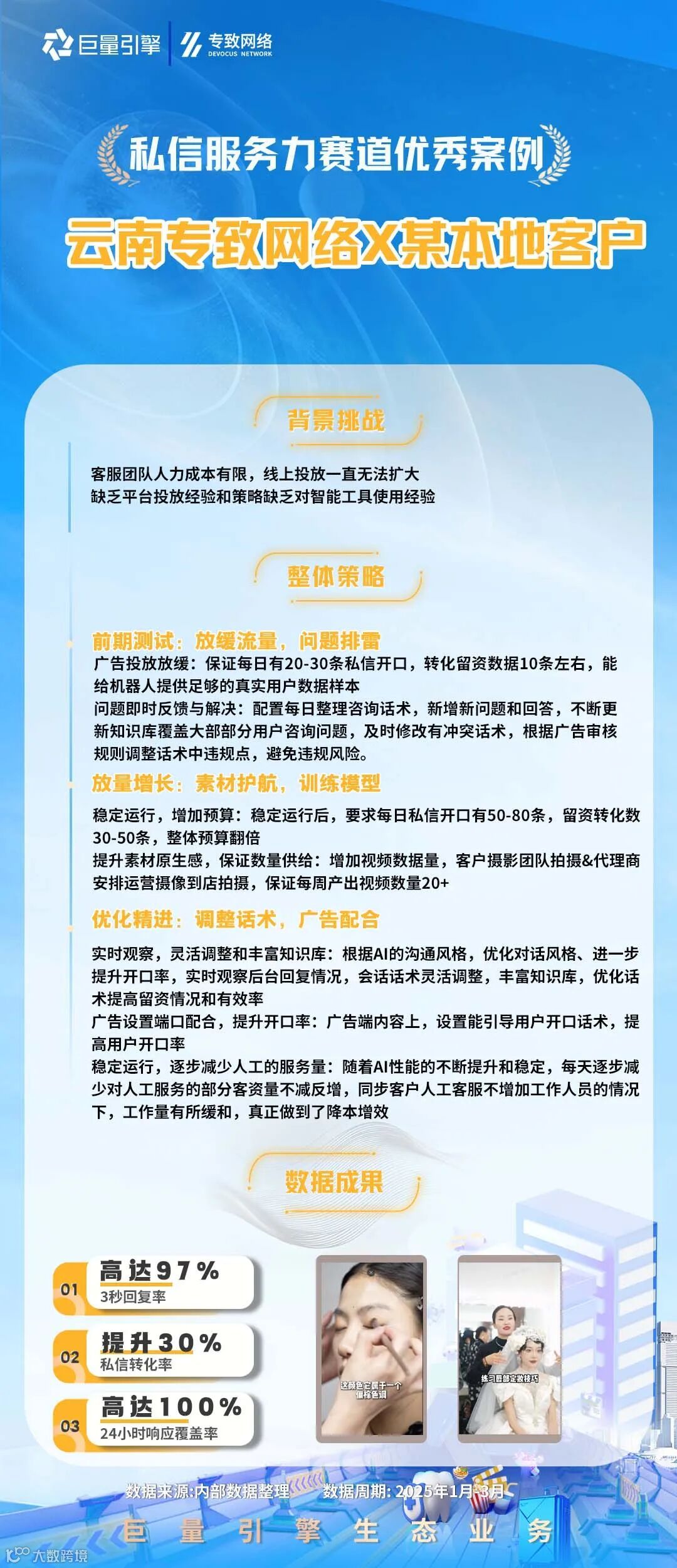 2025Q1首次融合本地&线索业务场景,根据年度策略导向打造了「私信服务力」、「短视频供给」、「直播提收」和「云图应用」四大课题,公开招募了148家代理进行课题报名,遴选了82家代理进行课题共建,本期共产出了49则有效案例。为保障公平性原则,本轮采用交叉评分,综合评估投放策略、产品应用、生意效果和行业方法,最终评选出积分榜top3及12则优秀案例。