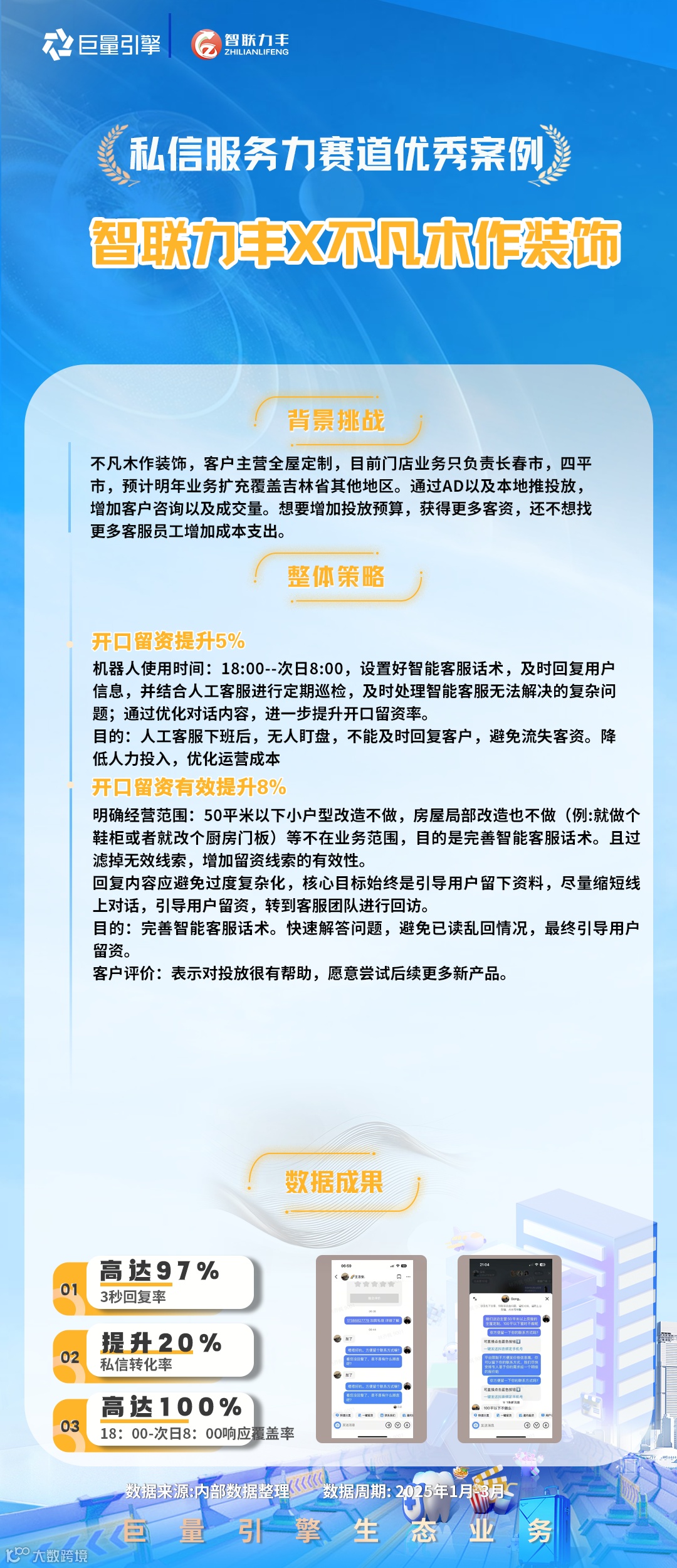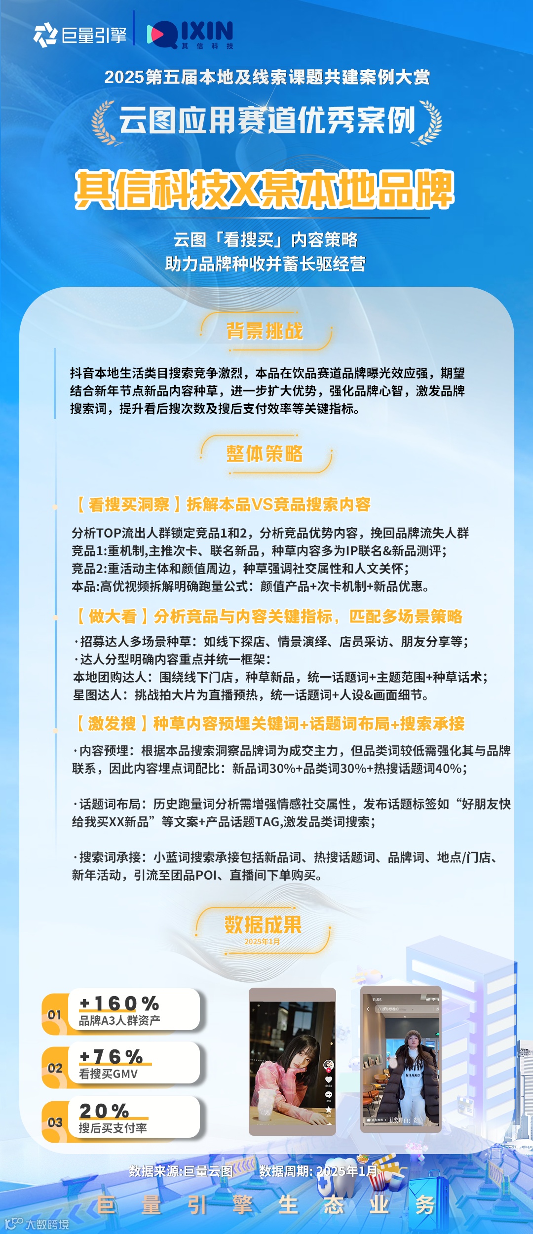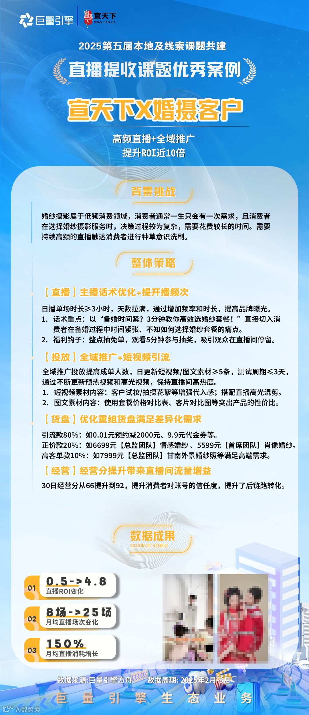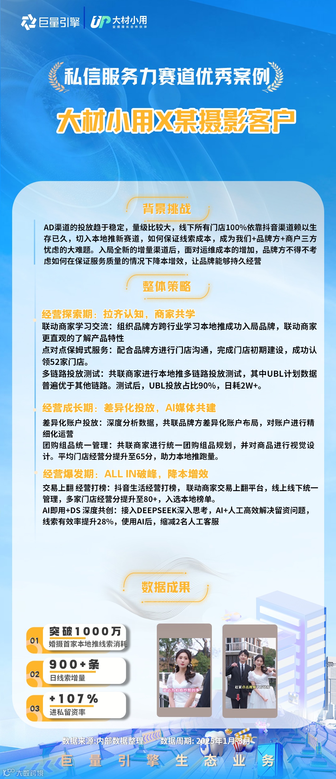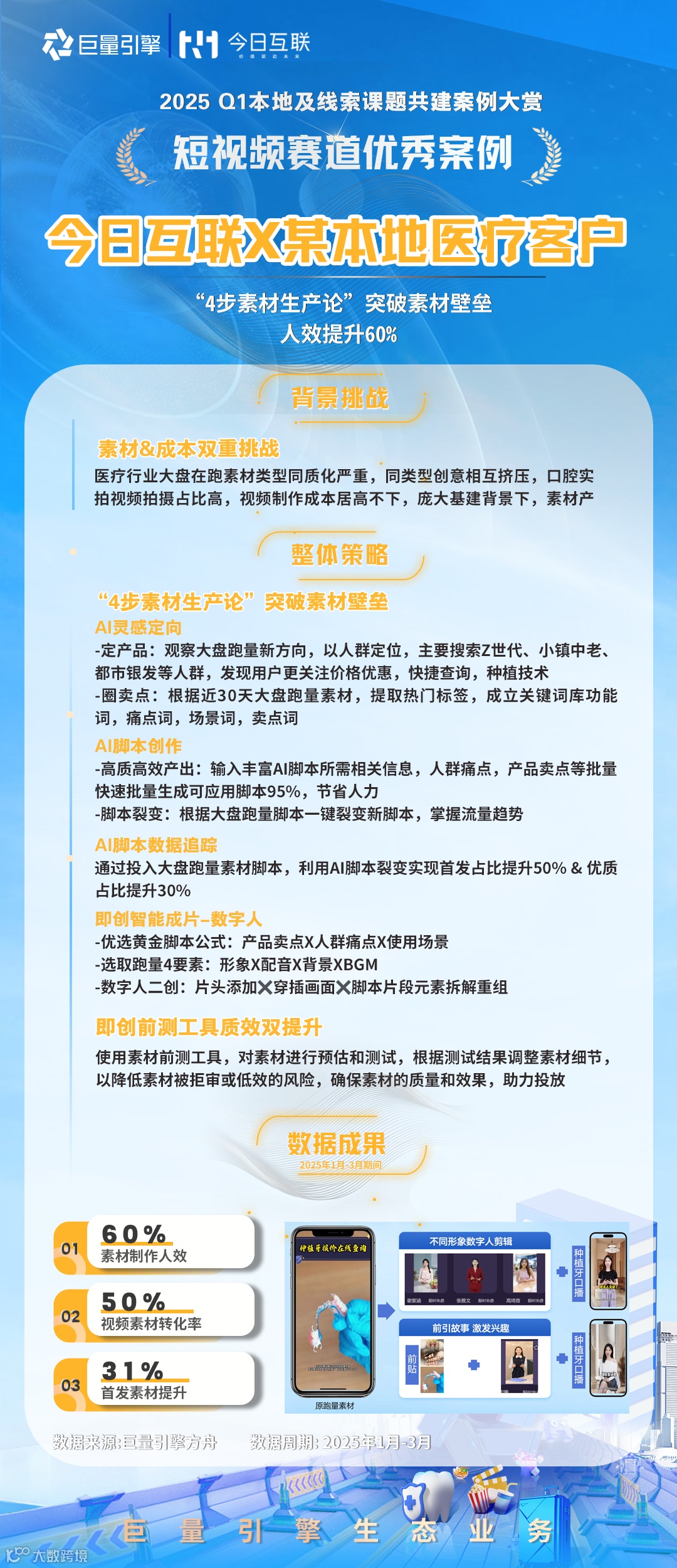 2025Q1首次融合本地&线索业务场景,根据年度策略导向打造了「私信服务力」、「短视频供给」、「直播提收」和「云图应用」四大课题,公开招募了148家代理进行课题报名,遴选了82家代理进行课题共建,本期共产出了49则有效案例。为保障公平性原则,本轮采用交叉评分,综合评估投放策略、产品应用、生意效果和行业方法,最终评选出积分榜top3及12则优秀案例。