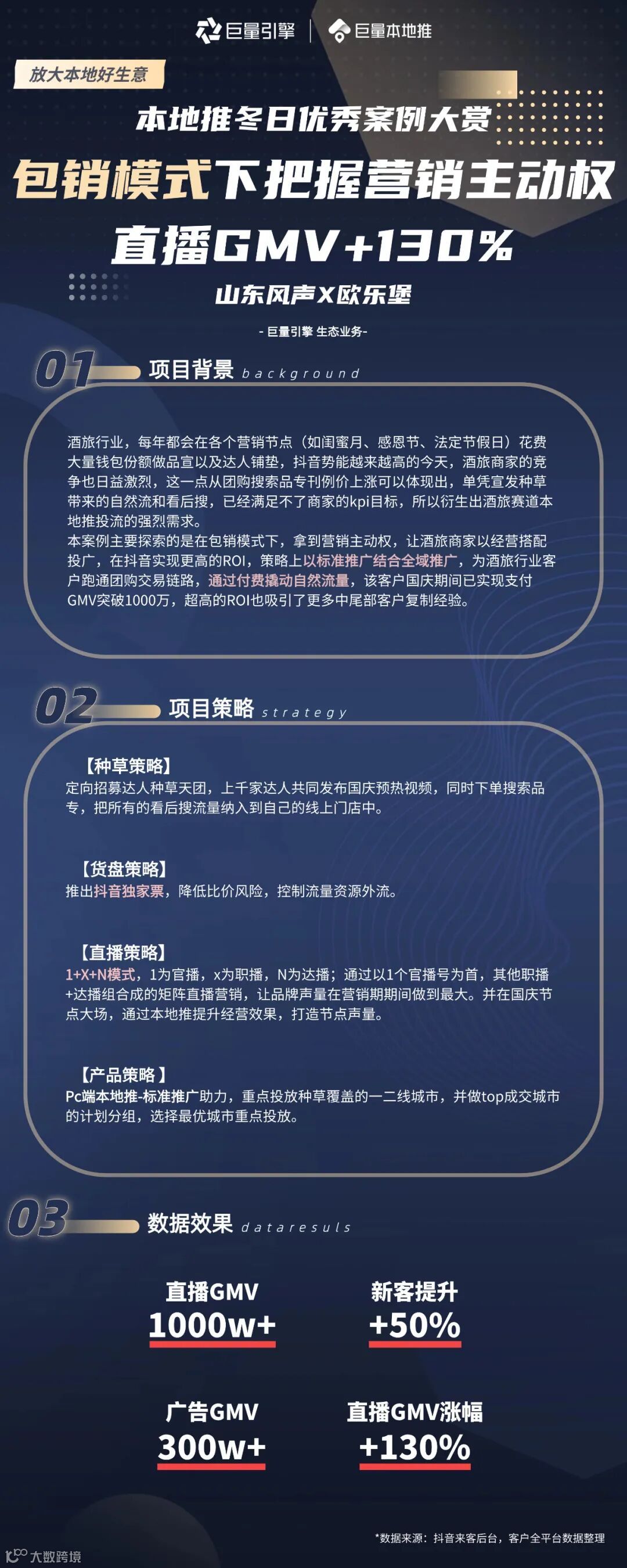 数据表现:通过官号聚合旗下强弱景区资源,组合集团旗下多地景酒资源,配合本地推全域自动探索人群,官号直播环比GMV+5600%。