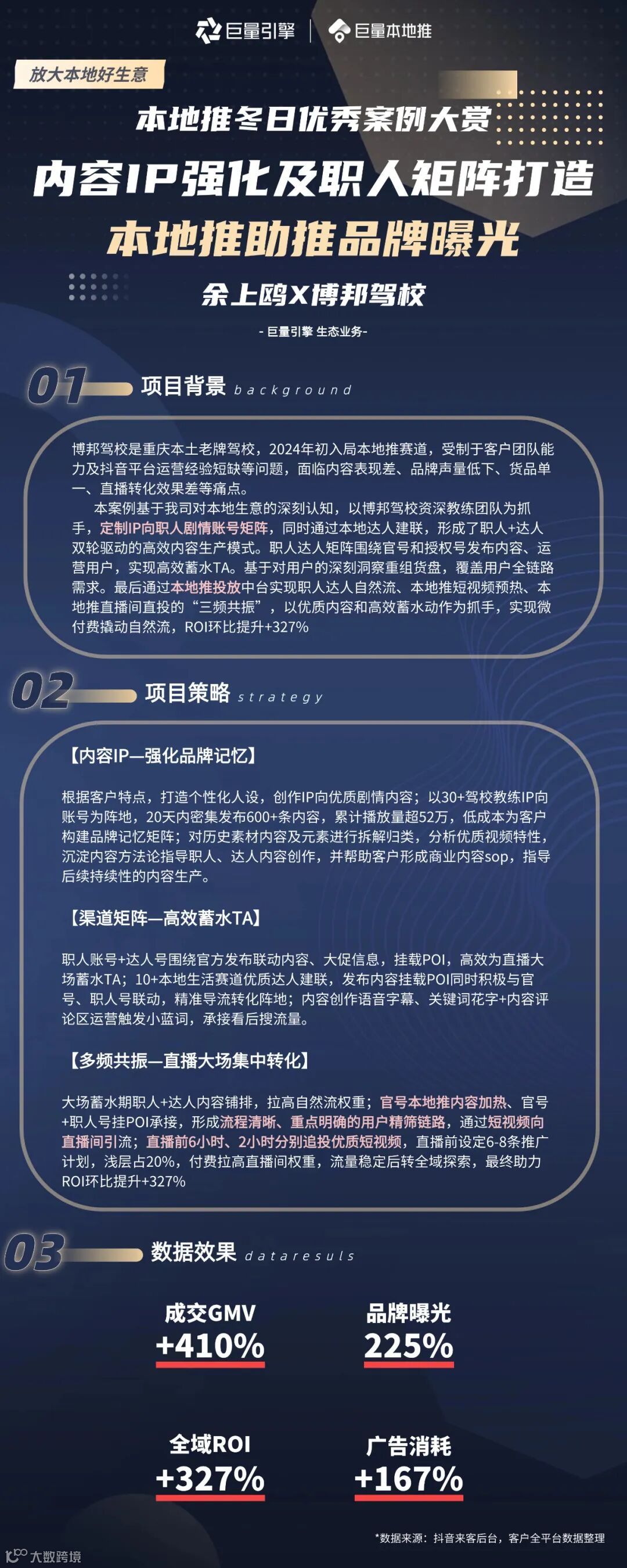 案例概述:博邦驾校是重庆本土老牌驾校,2024年初入局本地推赛道,受制于客户团队能力及抖音平台运营经验短缺等问题,面临内容表现差、品牌声量低下、货品单一、直播转化效果差等痛点。本案例以博邦驾校资深教练团队为抓手,定制IP向职人剧情账号矩阵,同时通过本地达人建联,形成了职人+达人双轮驱动的高效内容生产模式。职人达人矩阵围绕官号和授权号发布内容、运营用户,实现高效蓄水TA。基于对用户的深刻洞察重组货盘,覆盖用户全链路需求。最后通过本地推投放中台实现职人达人自然流、本地推短视频预热、本地推直播间直投的“三频共振”。