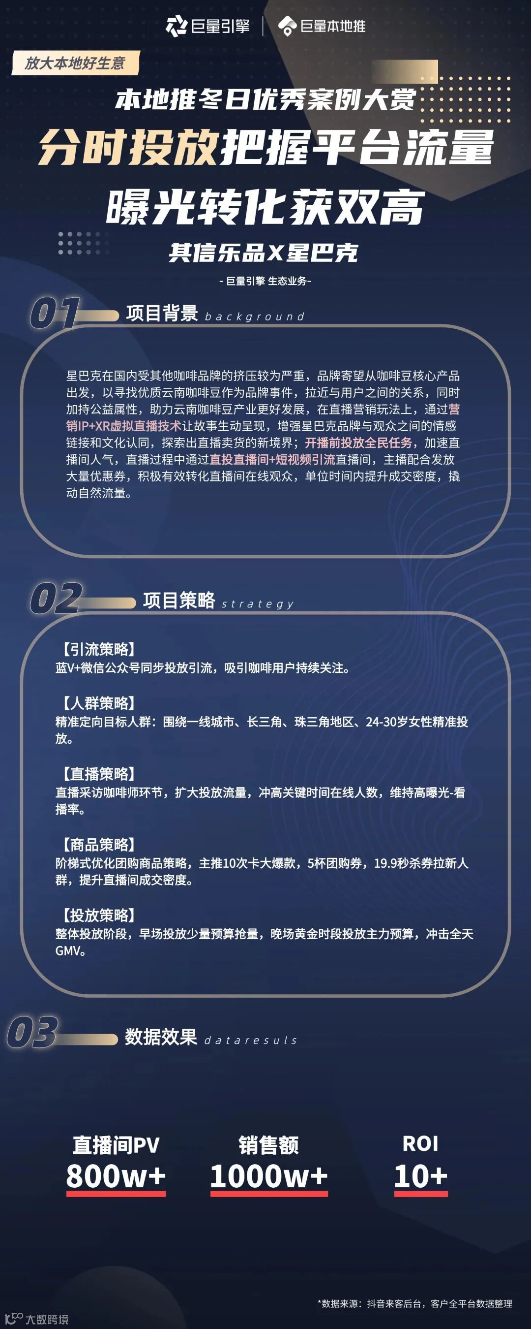 案例概述:星巴克在国内受其他咖啡品牌的挤压较为严重,品牌寄望从咖啡豆核心产品出发,以寻找优质云南咖啡豆作为品牌事件,拉近与用户之间的关系,同时加持公益属性,助力云南咖啡豆产业更好发展,在直播营销玩法上,通过营销IP+XR虚拟直播技术让故事生动呈现,增强星巴克品牌与观众之间的情感链接和文化认同,探索出直播卖货的新境界;开播前投放全民任务,加速直播间人气,直播过程中通过直投直播间+短视频引流直播间,主播配合发放大量优惠券,积极有效转化直播间在线观众,单位时间内提升成交密度,撬动自然流量。