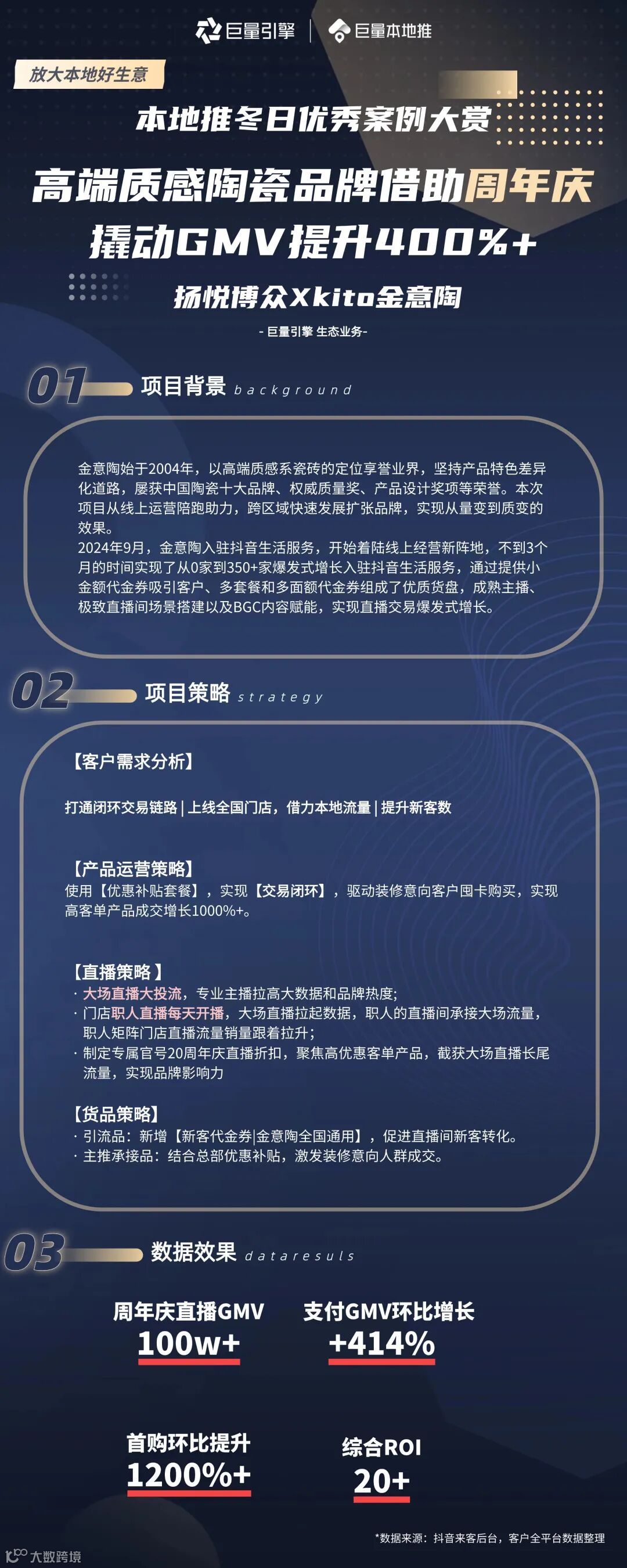 案例概述:2024年9月,金意陶入驻抖音生活服务,开始着陆线上经营新阵地,不到3个月的时间实现了从0家到350+家爆发式增长入驻抖音生活服务,通过提供小金额代金券吸引客户、多套餐和多面额代金券组成了优质货盘,成熟主播、极致直播间场景搭建以及BGC内容赋能,实现直播交易爆发式增长。