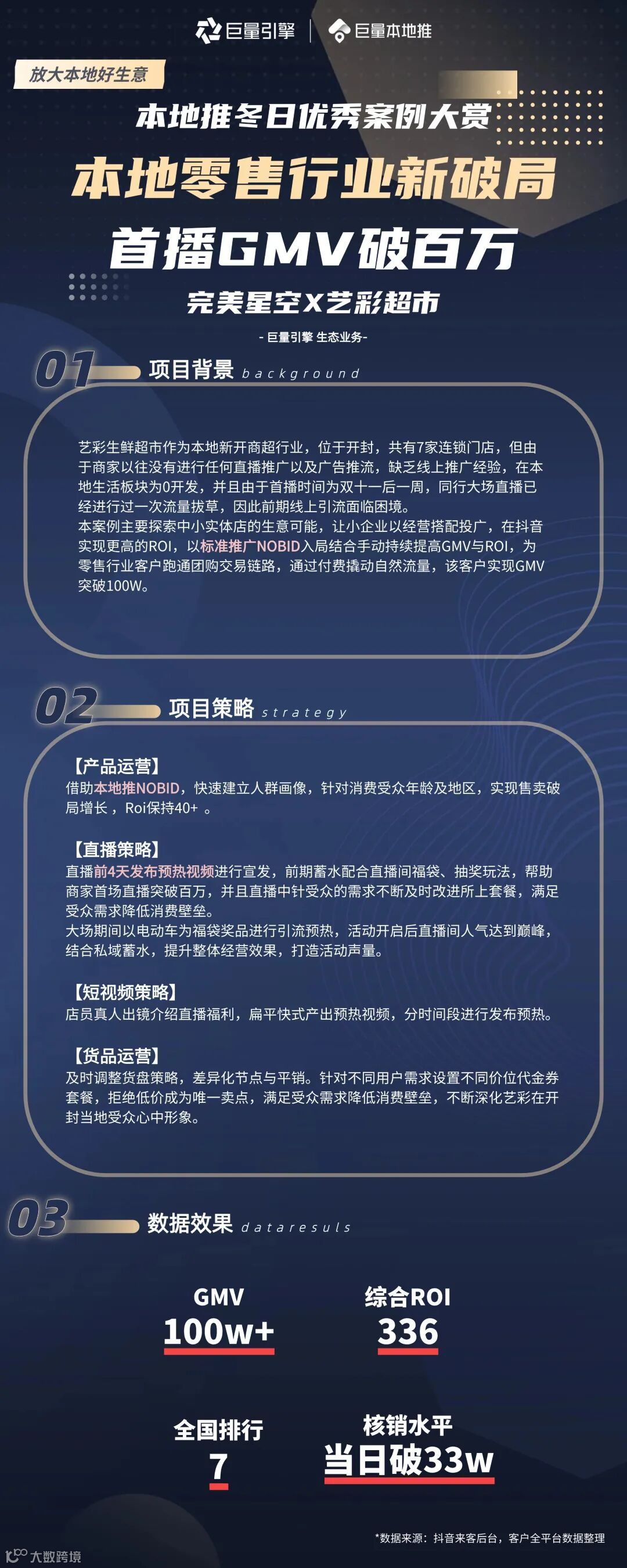案例概述:艺彩生鲜超市作为本地新开商超行业,由于商家以往没有进行任何直播推广以及广告推流,缺乏线上推广经验,在本地生活板块为0开发。本案例主要探索中小实体店的生意可能,让小企业以经营搭配投广,以标准推广NOBID入局结合手动持续提高GMV与ROI,为零售行业客户跑通团购交易链路,通过付费撬动自然流量,该客户实现GMV 突破100W。