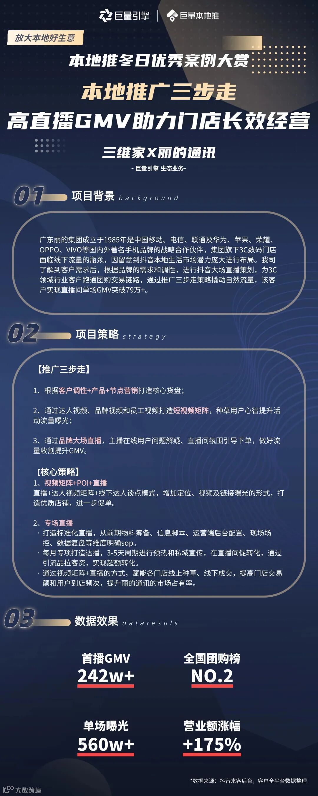 案例概述:广东丽的集团成立于1985年,是国内外著名手机品牌的战略合作伙伴。集团旗下3C数码门店面临线下流量的瓶颈,计划针对抖音本地生活市场的庞大潜力进行布局。本案例通过推广三步走策略撬动流量,根据客户调性+产品+节点营销打造核心货盘;通过达人视频、品牌视频和员工视频打造短视频矩阵,种草用户心智提升活动流量曝光;通过品牌大场直播,主播在线用户问题解疑、直播间氛围引导下单,提升GMV。