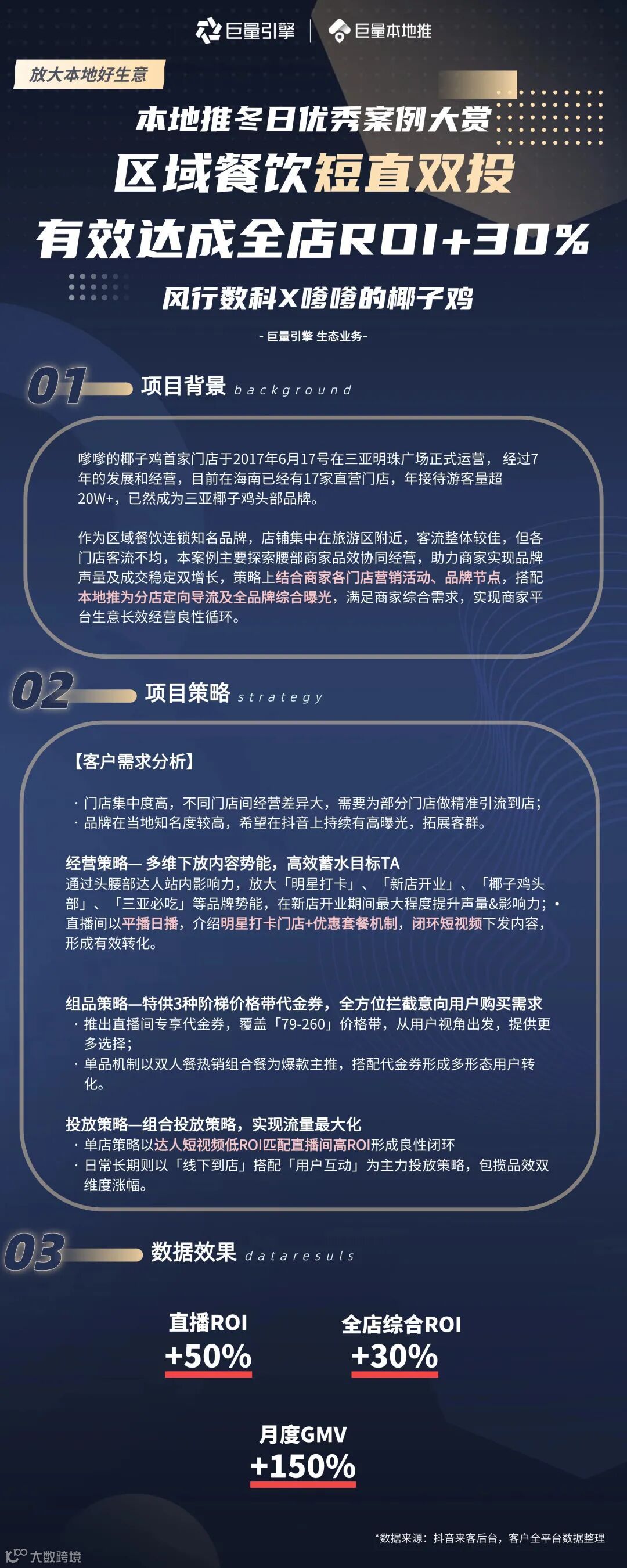 案例概述:嗲嗲的椰子鸡作为区域餐饮连锁知名品牌,店铺集中在旅游区附近,客流整体较佳,但各门店客流不均,本案例主要探索腰部商家品效协同经营,助力商家实现品牌声量及成交稳定双增长,策略上结合商家各门店营销活动、品牌节点,搭配本地推为分店定向导流及全品牌综合曝光,满足商家综合需求,实现商家平台生意长效经营良性循环。