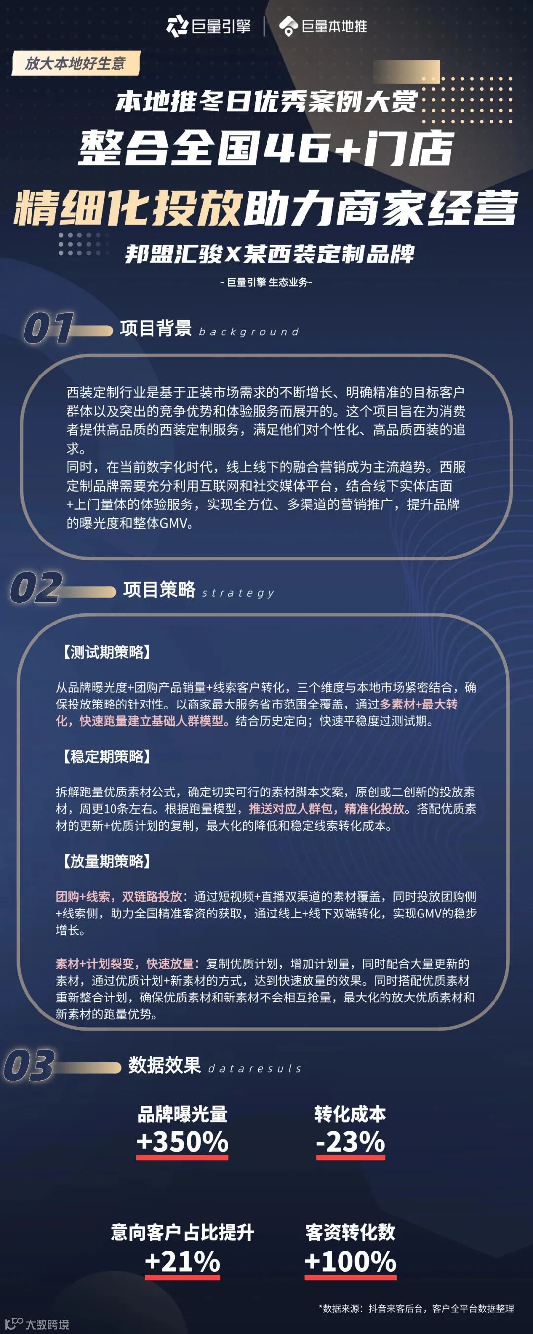 案例概述: 西装定制是基于正装市场需求的不断增长、明确精准的目标客户群体以及突出的竞争优势和体验服务而展开的。品牌旨在为消费者提供高品质的西装定制服务,满足他们对个性化、高品质西装的追求。本案例通过三个维度【品牌曝光度+团购产品销量+线索客户转化】设置投放目标,通过短视频+直播双渠道的素材覆盖,同时投放团购侧+线索侧,助力全国精准客资的获取,通过线上+线下双端转化,实现GMV的稳步增长。