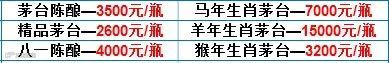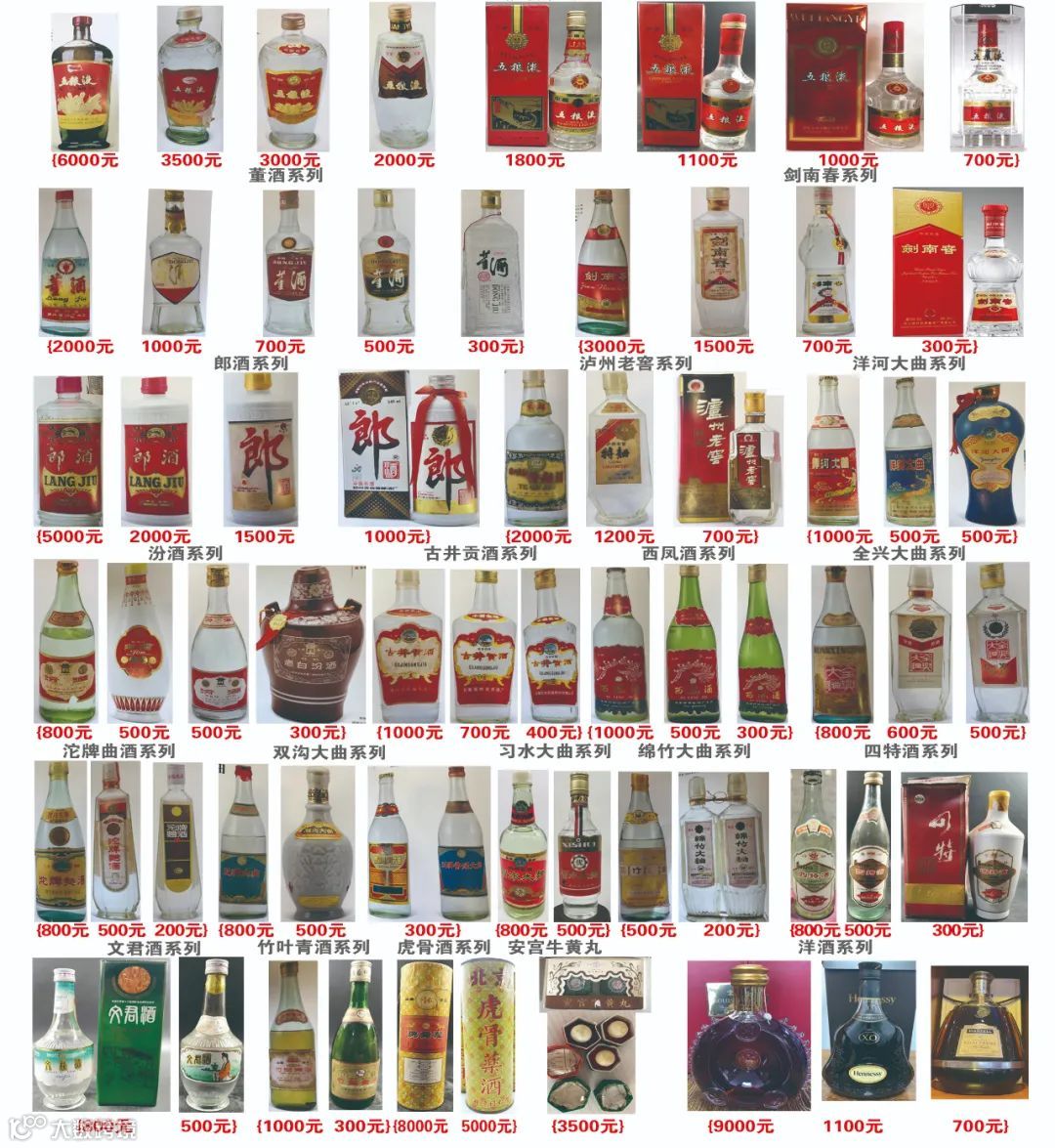 另收购2000年前后的高度五粮液、剑南春、郎酒、钓鱼台、董酒、古井贡酒、全兴大曲、酒鬼酒、泸州老窖、汾酒、西风及108种地方名酒,以及各种洋酒,虎骨药酒,安宫牛黄丸等。