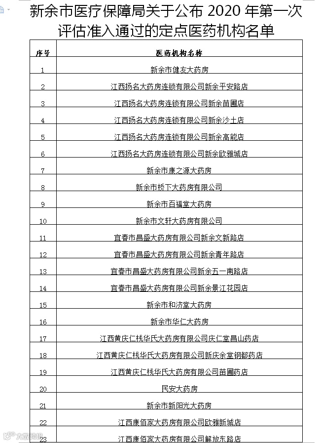 新余市医疗保障局关于公布2020年第一次评估准入通过的定点医药机构名单