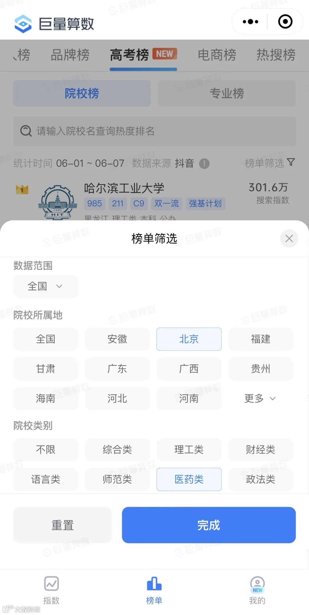 在上述三大平台,只需搜索“高考”即可进入「高考热搜榜单」专题页。在该专题页,用户可看到当前所在地区的“热门院校”、“热门专业”。用户在专题页搜索栏输入自己感兴趣的院校和专业名称,即可查看其热度排名;同时也可自行定制榜单筛选条件,按自己的兴趣选择数据范围、院校所在地、院校/专业类别等,全面了解相关院校、专业的热度。