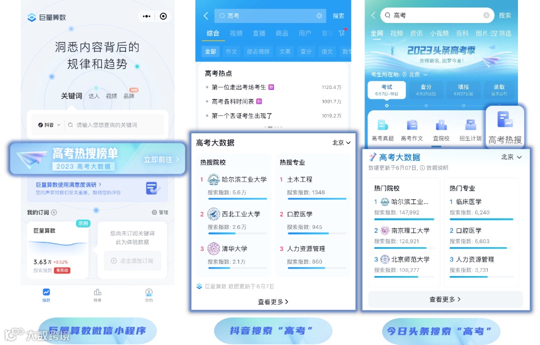 现在,巨量算数「高考热搜榜单」已在抖音、今日头条、巨量算数微信小程序上线,快去搜索“高考”,揭开 2023 年高考背后的真实面貌吧!