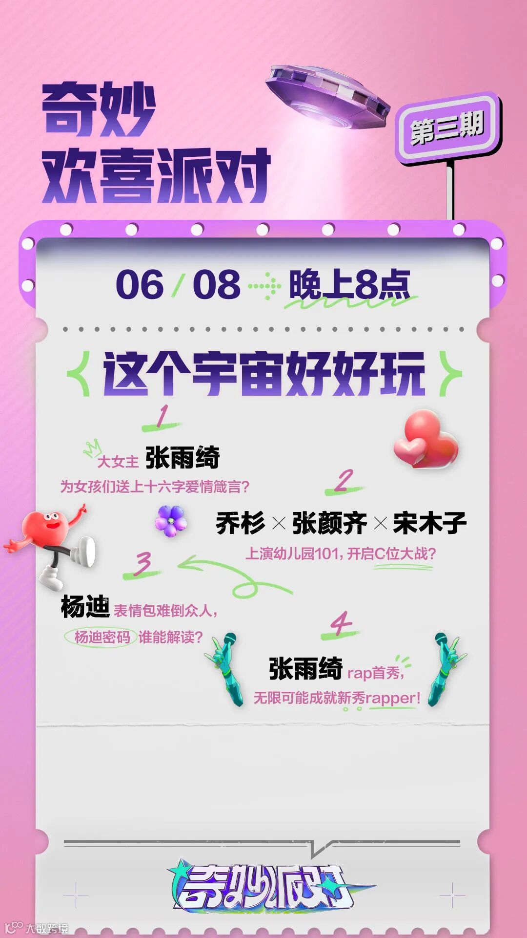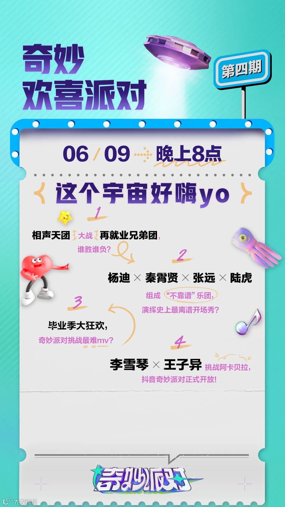 6月6-9日,在抖音用户可以通过上滑,沉浸式观看吴昕、孔雪儿、秦霄贤、杨迪、张远五位宇航员带领30+艺人在奇妙欢喜派对中不停穿越奇妙宇宙。