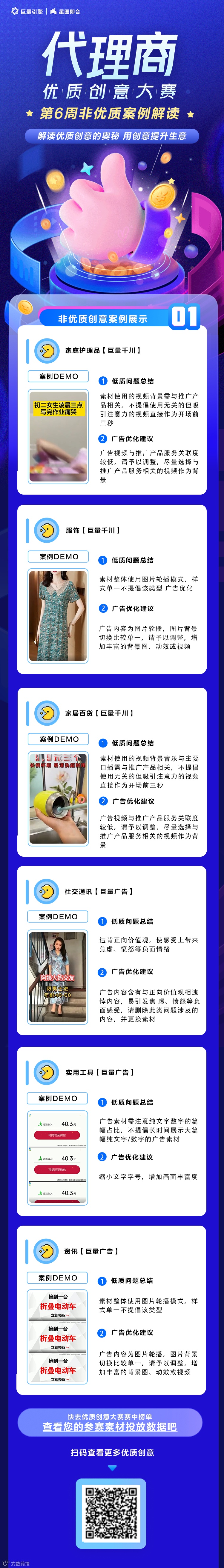本周重点解读家庭护理品、服饰、家居百货、社交通讯、实用工具、资讯六个行业出现的高频低质素材,通过对非优质内容的拆解分析,让同类问题得到改善,解读创意的奥秘,用创意提升生意。
