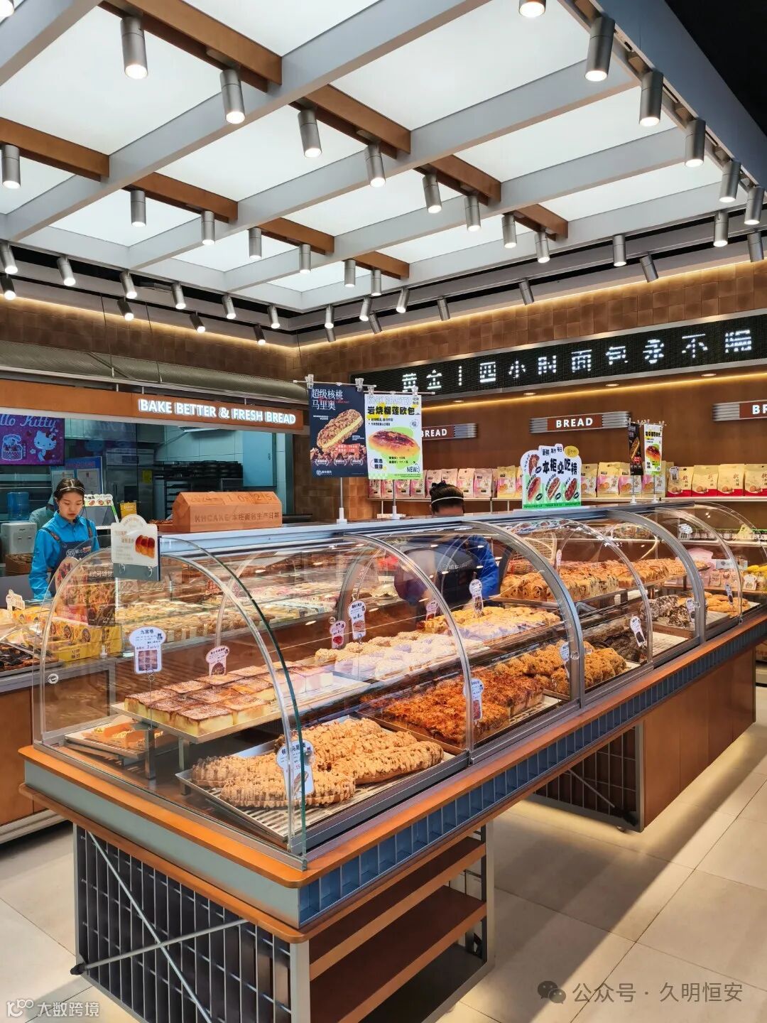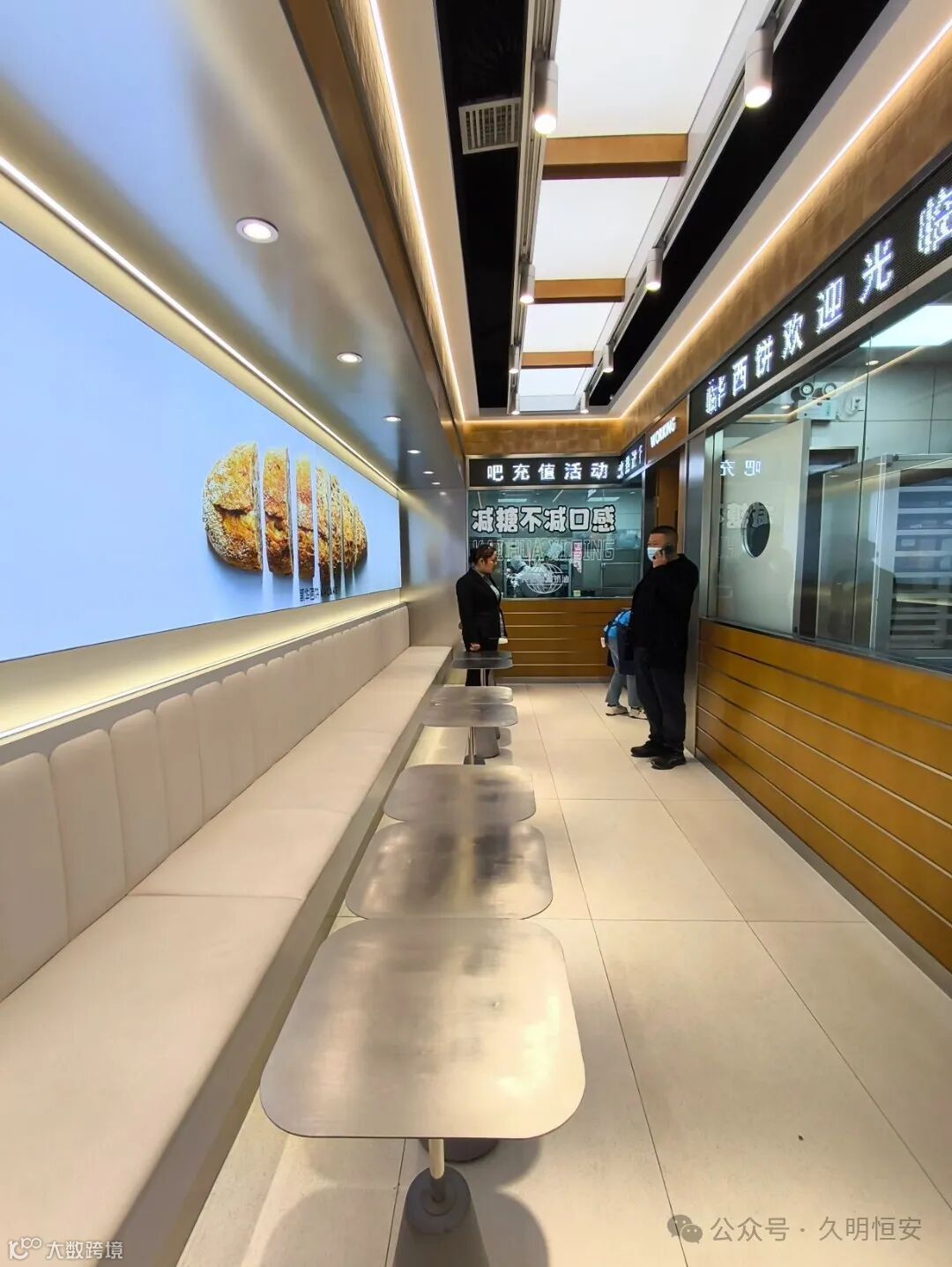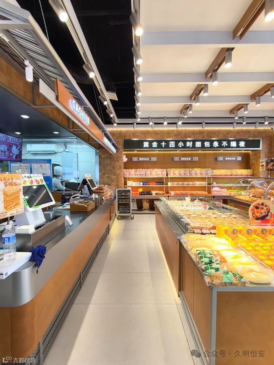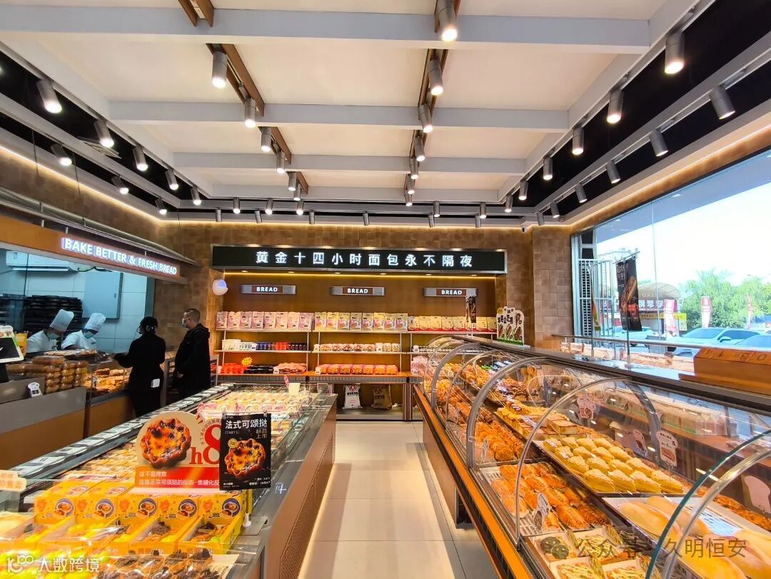 店内空间布局合理,展示区、操作区和顾客休息区划分明确。操作区干净整洁,顾客可以看到烘焙师的制作过程,增加对产品的信任度。