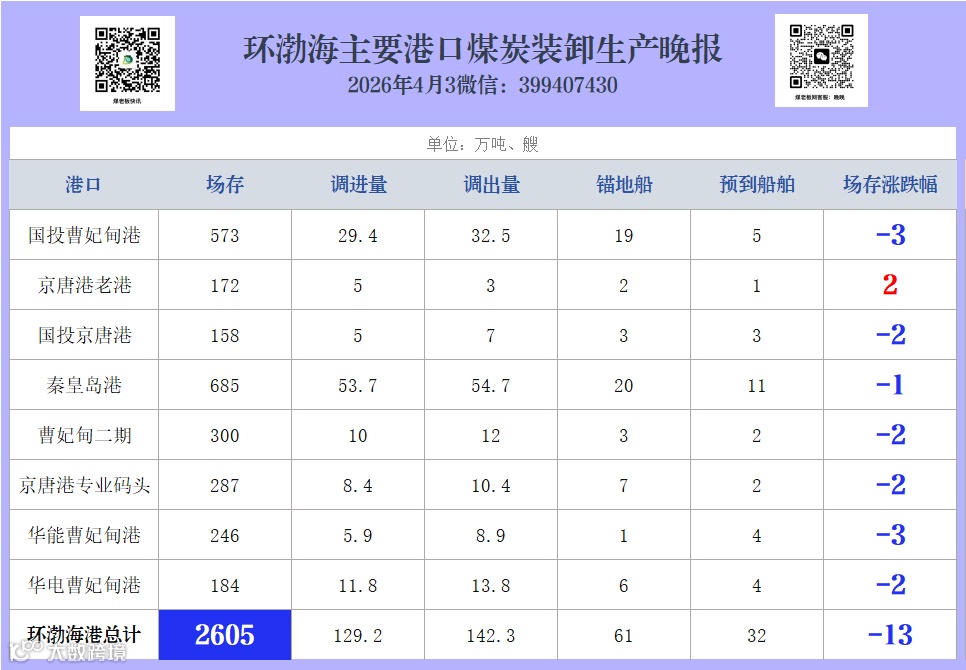 环渤海主要港口煤炭装卸生产晚报