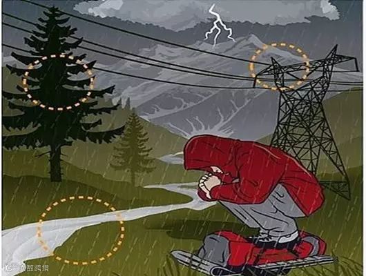 遇雷时,要在屋顶下方稍有空间的房屋躲避,如附近没有躲避场所,应蹲下两脚合拢,尽可能站在不吸湿的材料上,不要站在高大的单独树木下,避免靠近或接触高处的金属物体,如井架、栏杆、