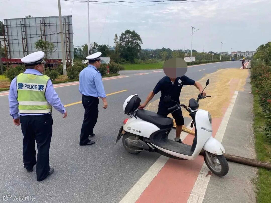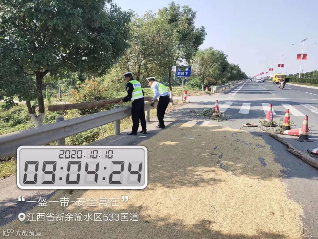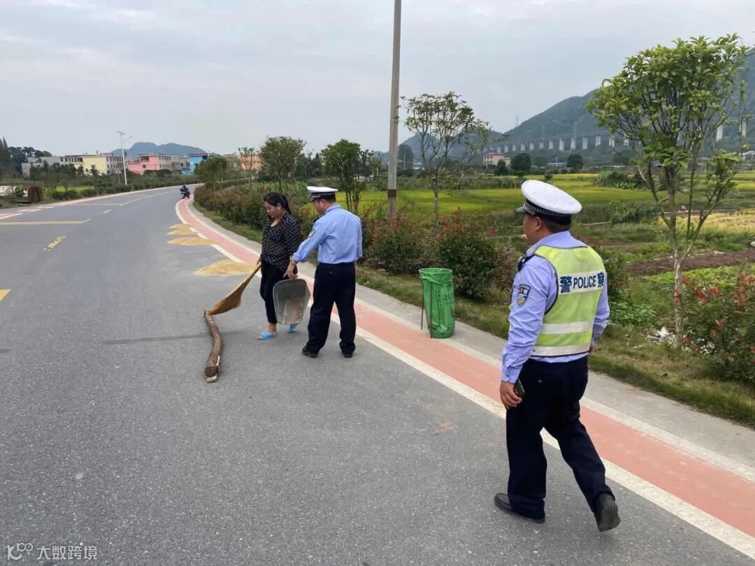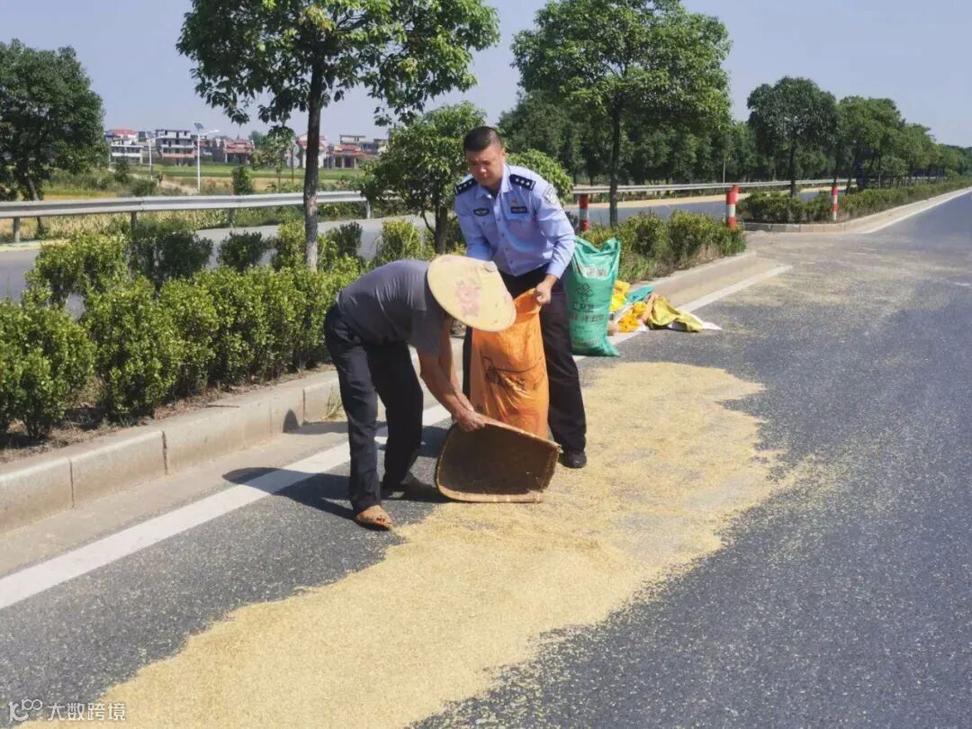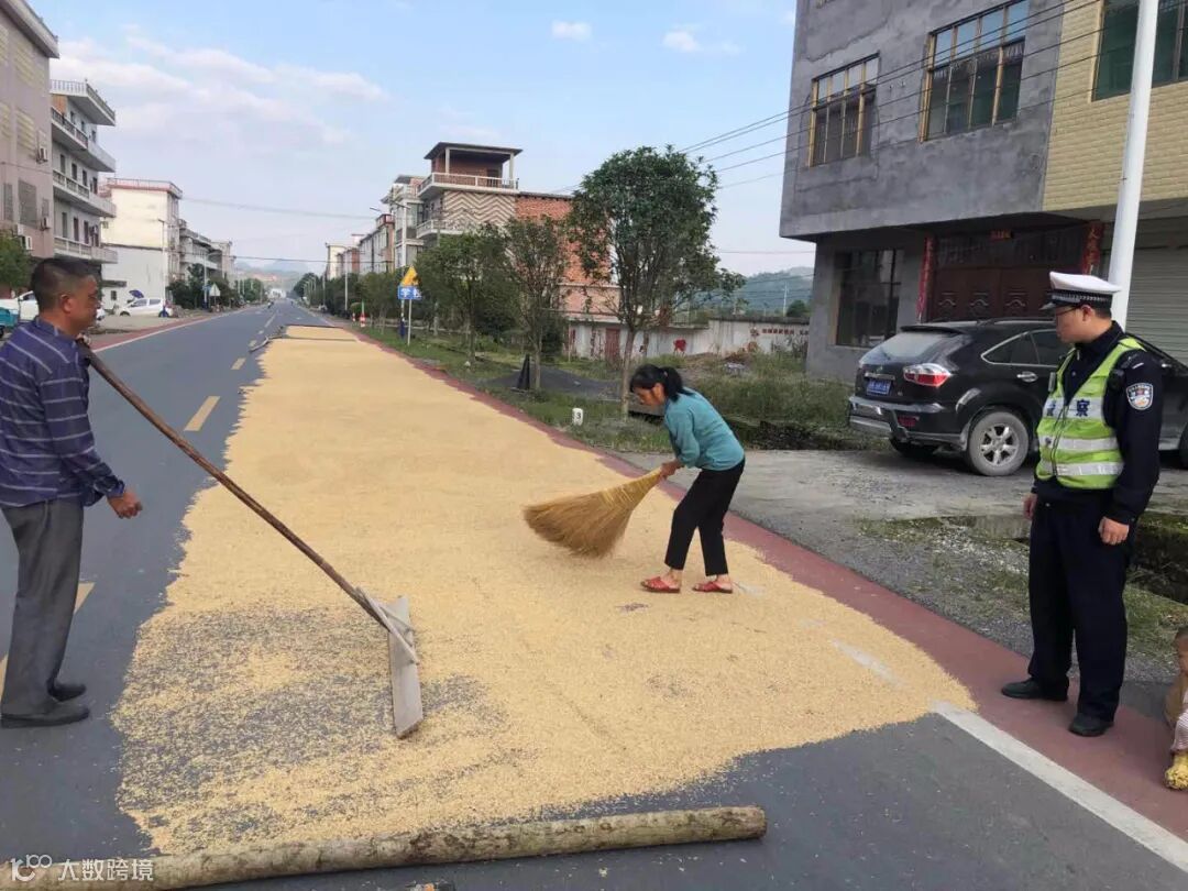 交警分宜大队根据辖区农村道路实际情况,开展交通安全大宣传大劝导活动,提高农村群众法律法规意识、交通安全意识,让其自觉清除公路上晾晒的谷物,消除道路交通安全隐患。