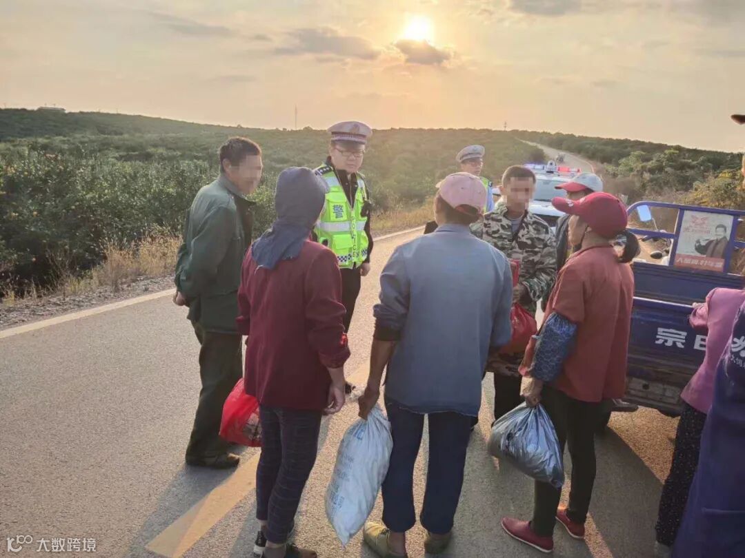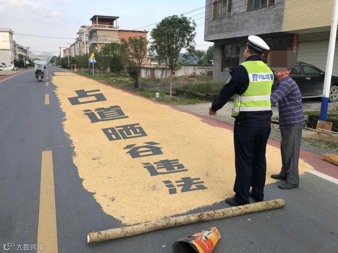 ▲针对占道晒谷的违法行为,大队民辅警对正在路上晒谷的农村群众进行劝导教育,告知其占道晒谷的危害性。
